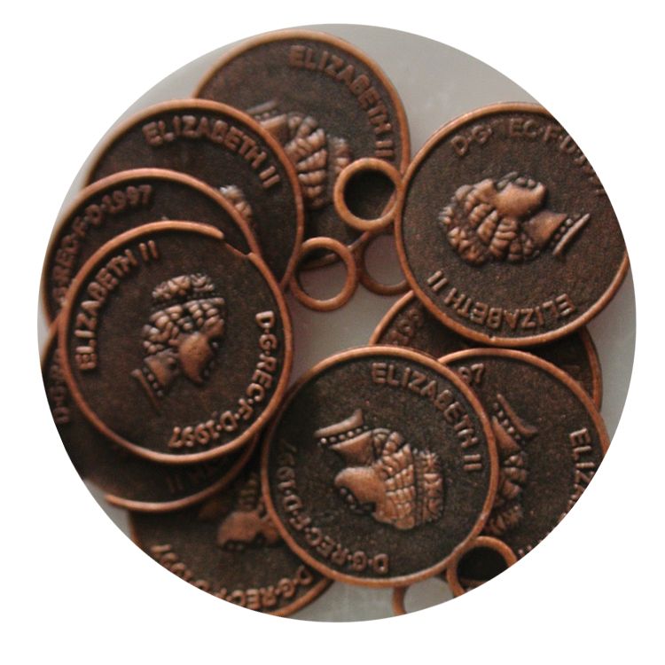 Bedel Muntje 14x17mm. Rood Koperkleurig.