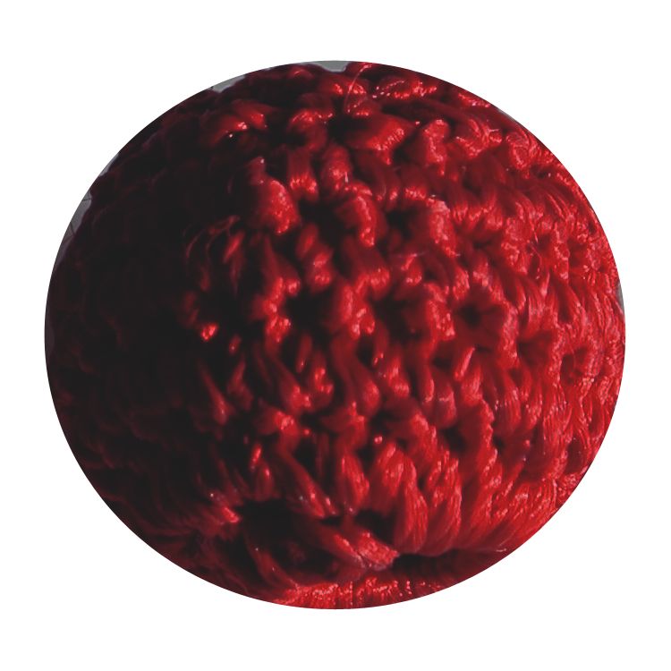 Gehaakte kraal rood met houten kern. Deze kraal is ongeveer 17mm breed en niet helemaal rond