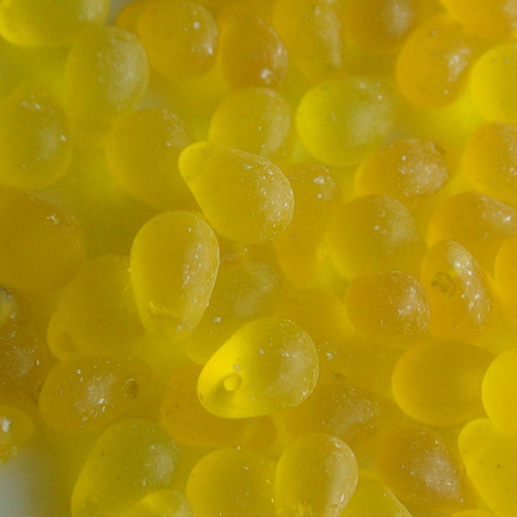Glaskraal druppeltje. 5x7mm. Mat geel Het gaatje zit bovenin de kraal. Per 100 stuks voor.