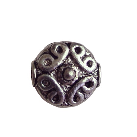 Metalen kraal. Bewerkt plat. 13x12mm. Zilverkleurig.
