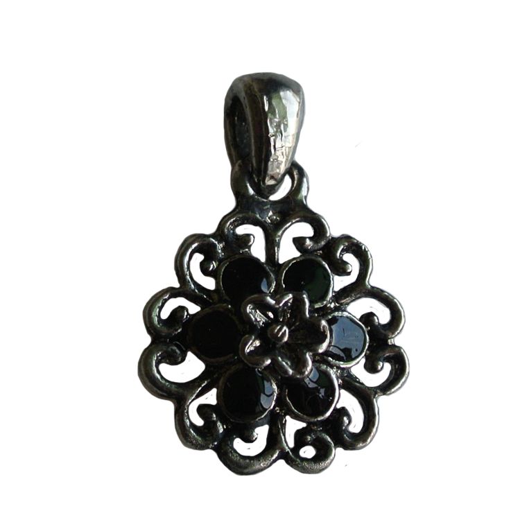 Metalen opengewerkt hangertje 20mm. Oud Zilverkleurig met zwart emaille