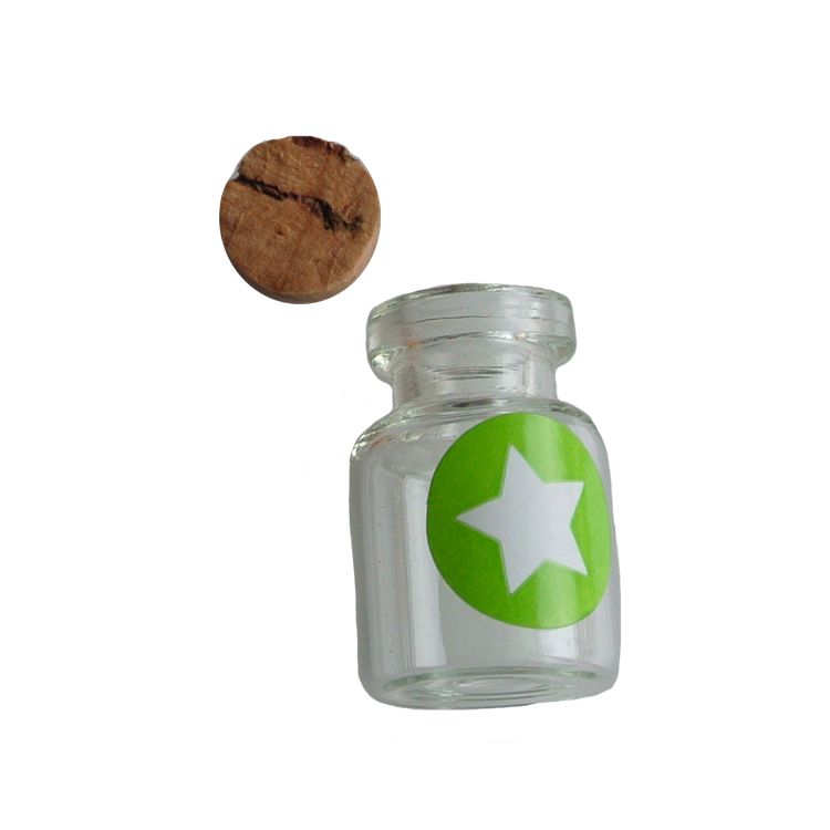 Mini flesje van glas met kurkje en reepje papier om een persoonlijke boodschap op te schrijven, 14x30mm